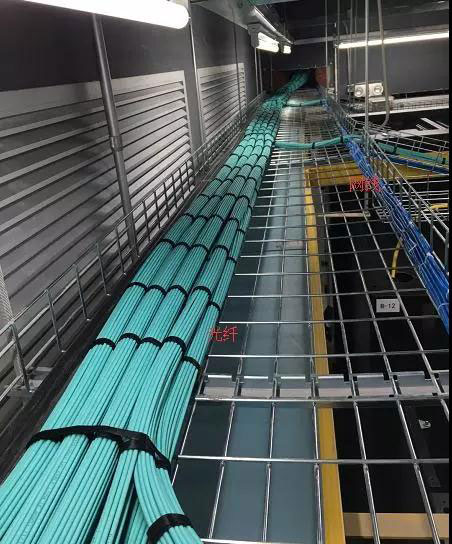 如圖所示,橋架內(nèi)光纖和網(wǎng)線分開整齊布放,每隔一段距離用扎帶捆綁,保持美觀。
