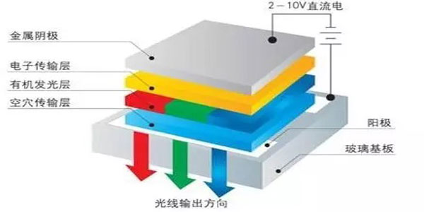 OLED在玻璃或塑料基板上堆疊成若干超薄層,其中多層有機化合物夾在兩個電極(陰極和陽極)之間。當在電極上施加電壓時,來自陰極的電子和來自陽極的空穴(正電荷)相互吸引并在發(fā)光層中相遇。當電子與正空穴復合時,OLED發(fā)光,以光子的形式釋放能量。