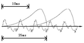 要對(duì)聲音進(jìn)行分析,需要對(duì)聲音分幀,也就是把聲音切開成一小段一小段,每小段稱為一幀。分幀操作一般不是簡(jiǎn)單的切開,而是使用移動(dòng)窗函數(shù)來實(shí)現(xiàn),這里不詳述。幀與幀之間一般是有交疊的,就像下圖這樣: